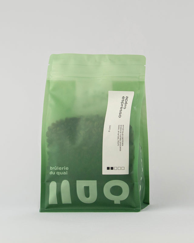 Apéro est un assemblage 100 % Arabica, issu d’Amérique centrale, traité en honey process. L’inspiration de cet assemblage est tiré des liqueurs fruitées et des fins de journée animées. Lumineux et expressif, il a été pensé pour les amateurs d’espressos texturés aux accents intensément fruités.